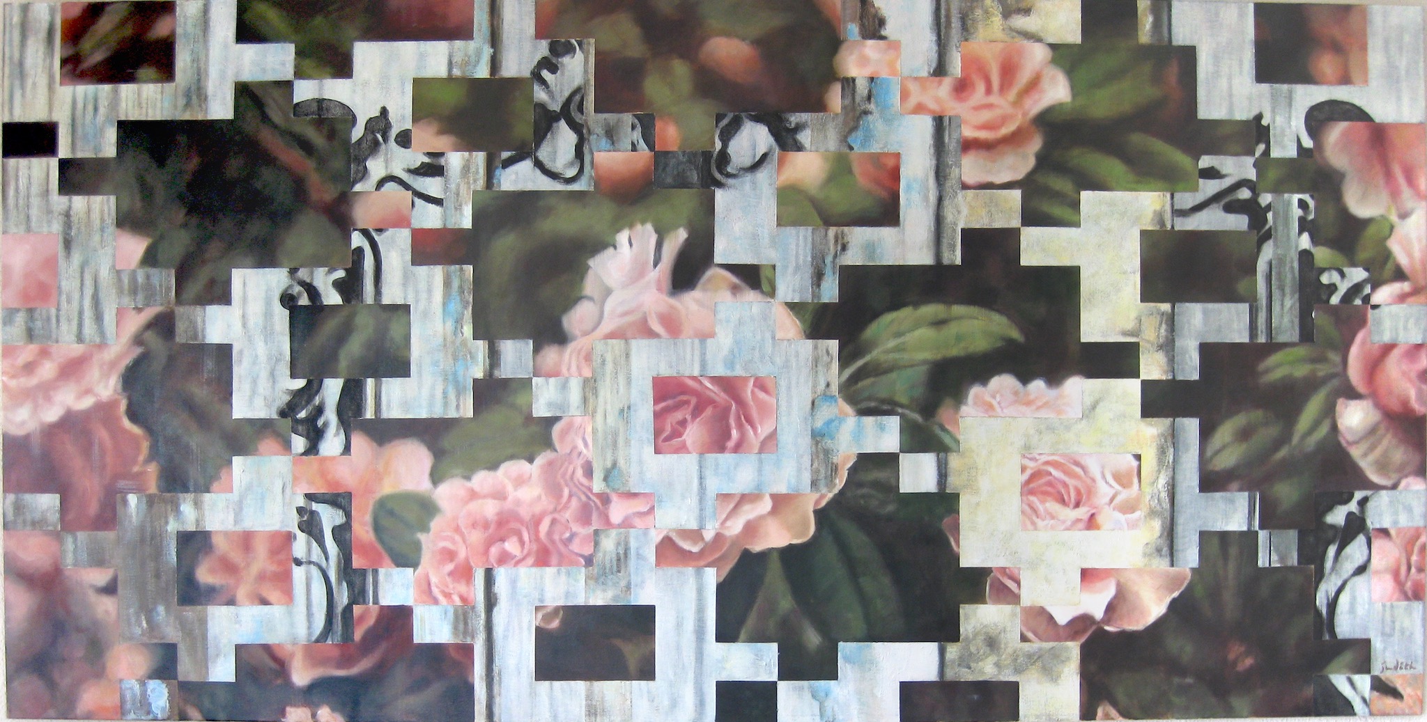 I use the concept of weaving to express multiple and related stories in one painting. Layering by the use of a grid, emerge patterns that have a unifying quality and create a rest and structure to the painting, bringing order in chaos.